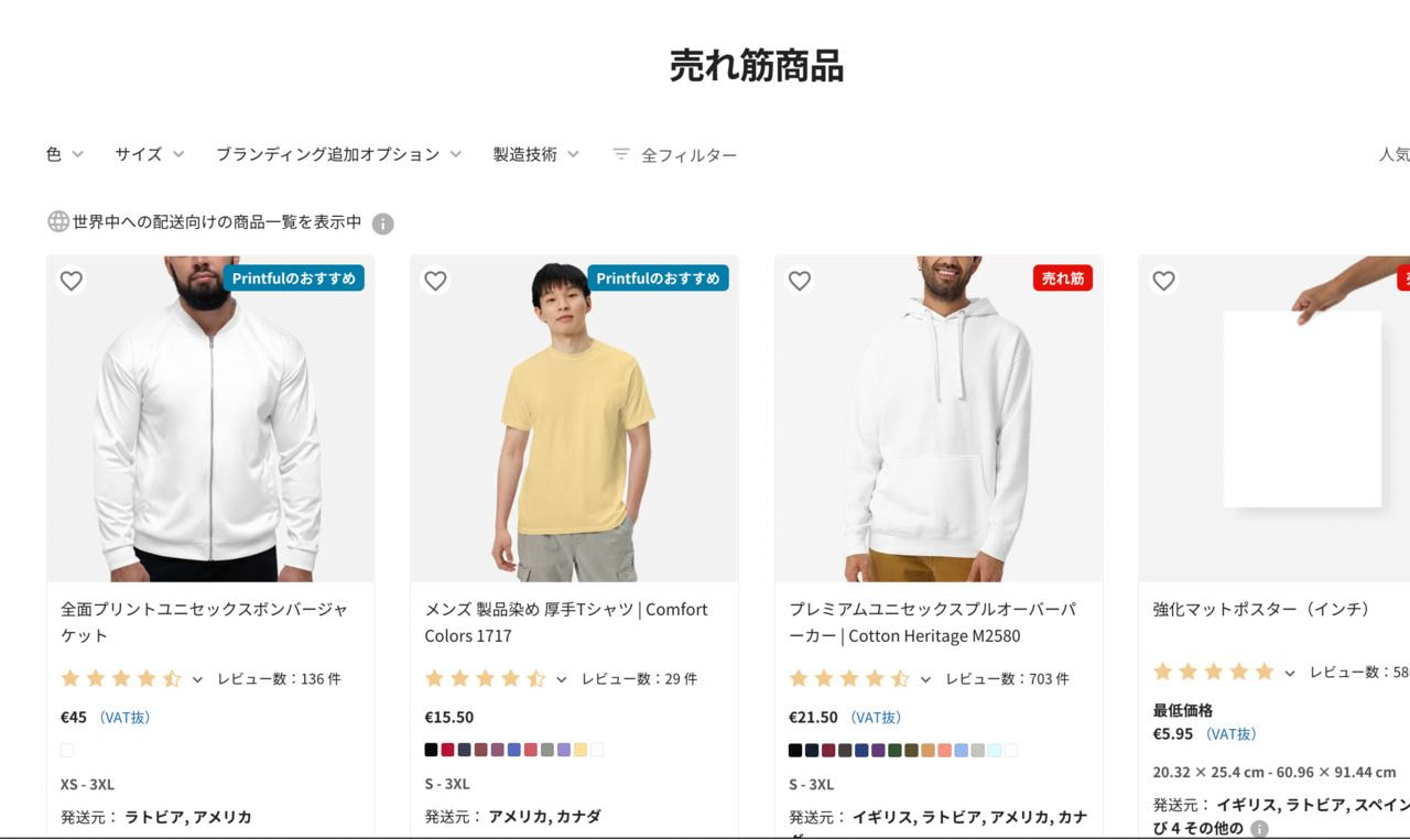 Printfulの製品&価格ページでトレンドアイテムを見つけたい場合は、「ベストセラー」ボタンから探してみましょう。現在お客様に最も人気のある商品が表示されます。